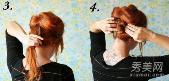 然后,在刚刚分开的下半部分的头发上扎一个马尾辫,把扎好的马尾辫拧成一个小圆包,用一个黑色的小夹子固定在头上。