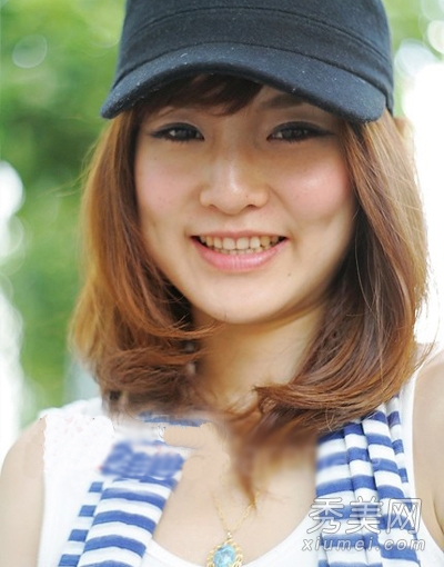 中等头发的梨花头和麻颜色的鸭舌黑帽的搭配看起来很时髦。