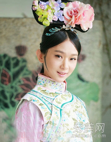 中间的刘海突出了清纯的脸庞,却不失清宫女性的气息。各种各样的头饰都被装饰得美丽而耀眼。