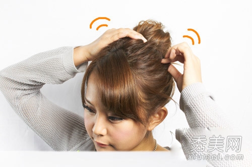 首先,让我们看看这个肉丸头打结方法。前额上的刘海都扎了起来,露出了一个饱满而白皙的前额。高耸的肉丸子头用梳子制造蓬松感,充满活力。