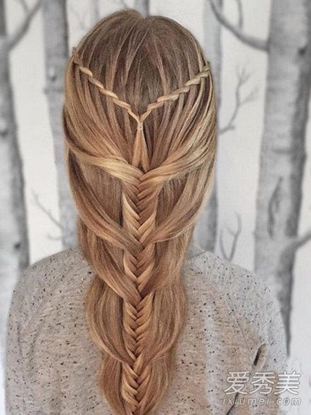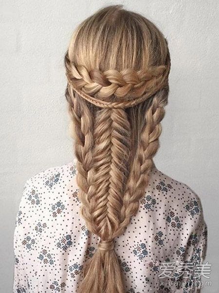 这种发型更复杂,但仔细分解并不难。上部是一个三股的花环状的辫子,然后加上一条细辫子。下部两边有简单的三股,中间是鱼尾辫,两端最后绑在一起。