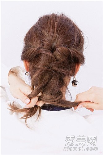 4.挑选左右两边的发束,旋转3圈后,把它们和编好的头发拧成一束。