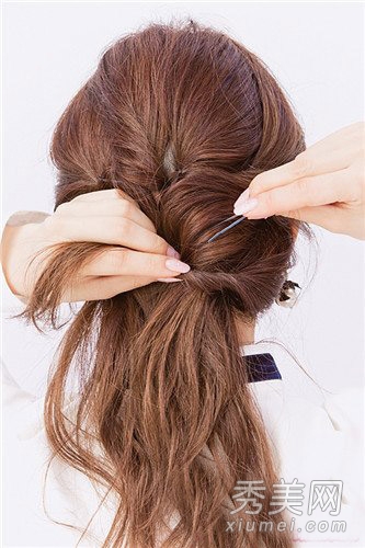 5.将耳朵下面的发束向后转到后脑勺,固定在发辫下面。