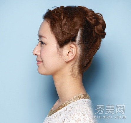 第二步:从侧面扭转发束,并将其拉到脑后卷起来。