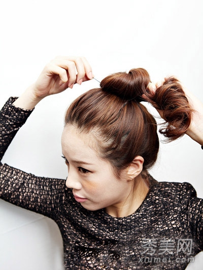 第三步:将编织好的辫子拧成花角,用发夹固定