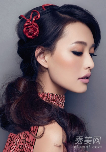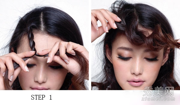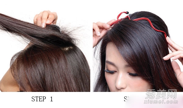 第四步。从发带下方左侧固定的头发中取出一缕头发,卷到发带下方。用同样的方法在右边形成一个自然的弧度,隐藏发带的下半部分。