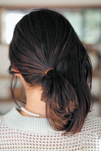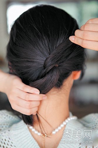 在第一步中,抓住左耳右侧的头发,并在不断补充的同时扭转它。将步骤1中的结包起来并盖住,然后固定住。
