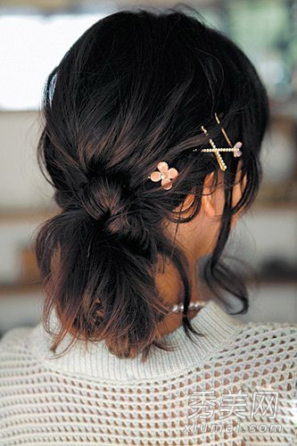 在右耳上点几个发夹。调整到从正面可见的形状。在背上戴更多的发夹表明更成熟。