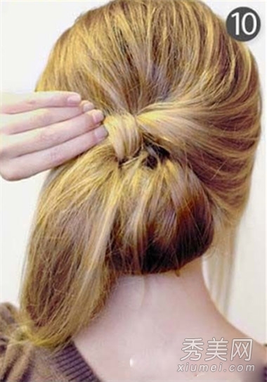 这一步是将前刘海的一部分松散地梳到后脑勺的顶部,并将头顶与刚刚选定的一束头发绑在一起。