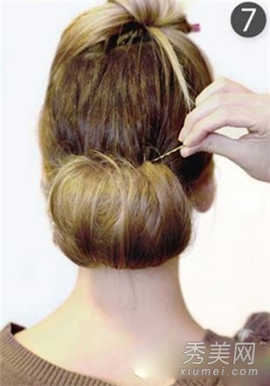 上一步之后,用一个小发夹把刚刚做好的发髻固定住,并试着把细分的头发夹在里面,创造一种弧度感。