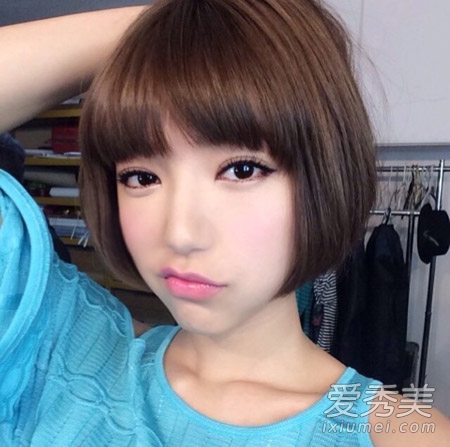 可爱的发型有着整齐的刘海和发髻,发髻只是裹在脸颊上很可爱,整洁的建材店的发尾,能够剪短直发,整体非常甜美,可以减少年龄。