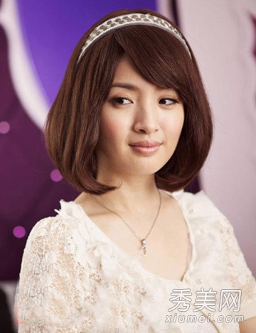 粉色修身皮裙,时尚中带着帅气感,巧妙的斜刘海短发,同色宽发带装饰,眼睛交际花范。