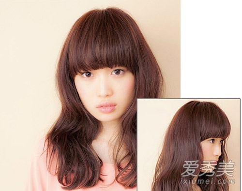 发型评论:浓密的刘海遮住前额,衬托出生动的眼睛。长卷发沿着脸型烫出美丽的卷发,使脸型更加完美动人。