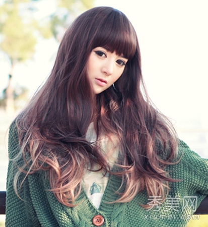 可爱的修剪脸,小V型脸站哦,蓬松的发型长卷发,整齐的刘海,大波浪卷,非常女性化的一个