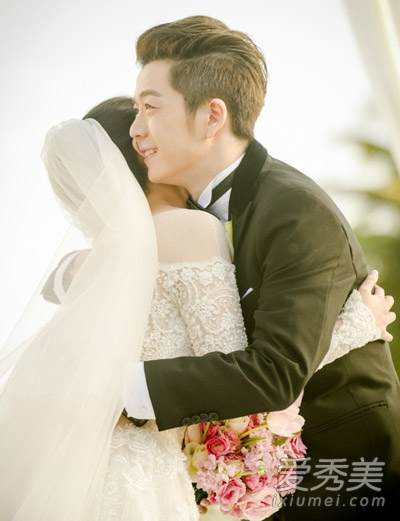 那对深情地看着对方的夫妇表现出甜蜜。阿虎、岳的黑色西装和白色衬衫更显优雅。可爱的新娘微笑着,优雅的面纱显示出一种美学气质。
