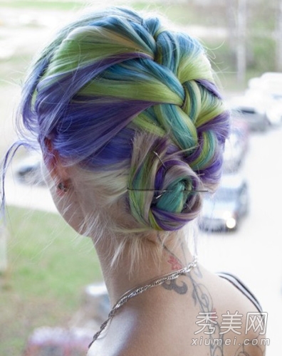 这种配色也很漂亮。绿色、蓝色和紫色混合在一起,用凤尾蕨的辫子做成一个发髻,让人眼花缭乱。
