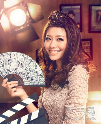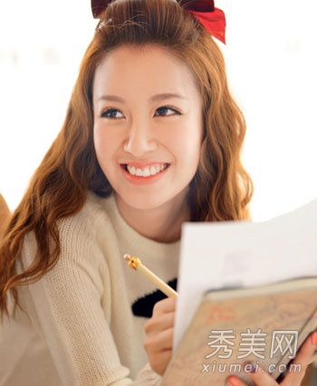 轻柔的长发微微卷曲,前额的长刘海翻到了后脑勺,然后刘海用大蝴蝶结发夹固定在后脑勺。发型很简单,但不失一个精致的小女人的感觉。