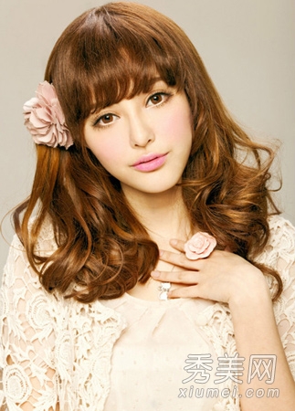 这是一个美丽的发型,金黄色的卷发自然下垂,刘海略微倾斜,显示出淑女的气质,而一边的粉色花朵装饰增加了女孩的甜美。