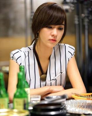 一种罕见的刘海发型,所以韩式刘海看起来和她的有点不同,棕色染发更时尚。