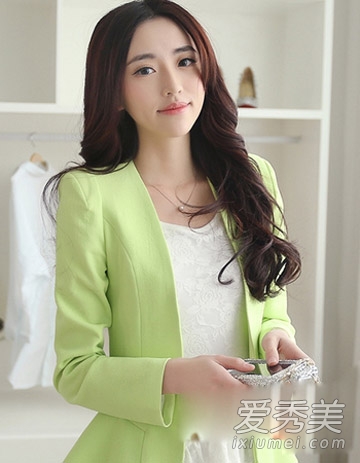 气质的分裂螺旋卷发勾勒出无与伦比的优雅和气质。修身抹胸绿色套装清新、醒目、优雅。