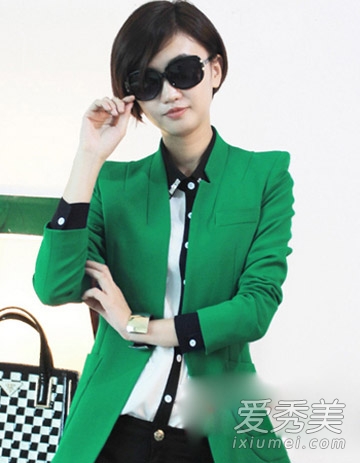 草绿色翻领套装展现出无与伦比的清新。一个帅气的女孩的短发与黑色的镜子勾勒出别致,英俊和时尚的外观,与简单和个人的风格。