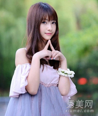 整洁的刘海有一点清新的风格,蓬松整洁的刘海瞬间包住宽阔的额头,点缀出精致的小V型脸,自然的微卷发清新、甜美、知性。