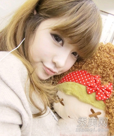 韩式发型,整齐的刘海和卷曲的头发可以创造丰富的头发,达到瘦脸和面部修复的效果。棕色的头发衬托出白皙的肤色。