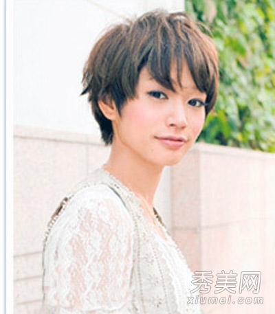 女孩的短发有个性的风格,女孩的短发经过特殊处理,内卷的弧度,大的短发聚集在脸上,营造出蓬松的效果,女孩的脸衬托得很小,这种短发也营造出干净的效果,刘海在中间,突出了女孩的ol风格气质。