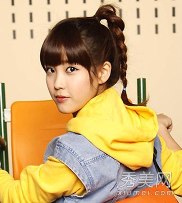 一种简单的适合校园MM的长发扎法,比普通的马尾辫多设计了一个台阶,扎着高高的辫子,留着韩式刘海,留着甜美可爱的女孩发型。