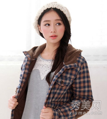 充满韩国风味的简单发型。自然的长发在旁边梳着鱼骨辫的发型。拢在一起的头发清新明亮。配一顶帽子很有艺术感。