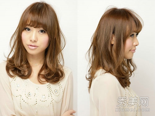 没有刘海的甜梨花头有100%的纤体效果,微微卷曲的发尾看起来非常甜美可爱。