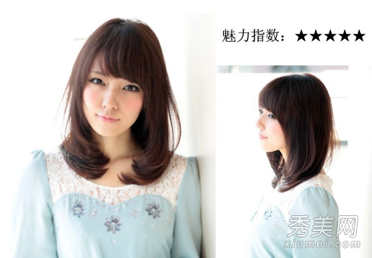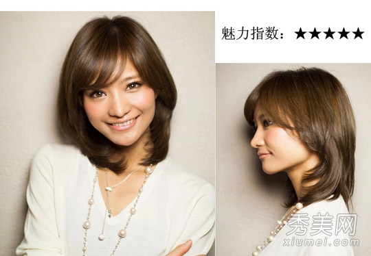 斜刘海有瘦脸的效果,棕色头发与肤色相称,头发被修剪成多个渐变,形成一层碎发,散发出一种甜味。