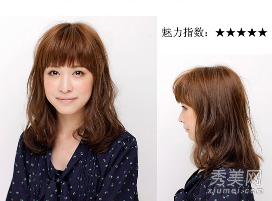 遮盖前额的斜发和肩发具有修复皮肤的作用,配以巧克力色染色衬白皮肤。