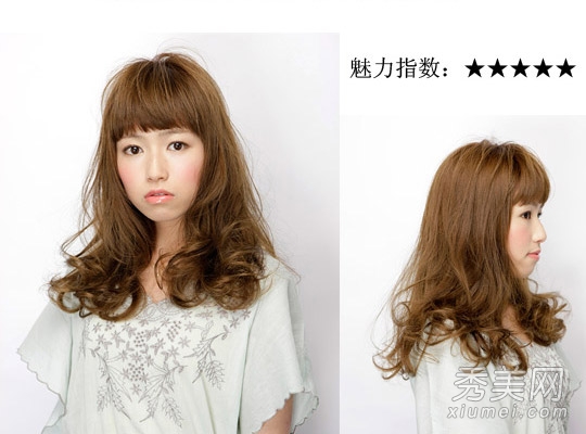 特殊的卷发显示了个性,整齐的刘海形成了鲜明的对比。