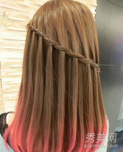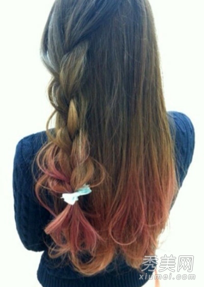 简单的渐变色和染发,一边只有一条斜辫子,红色高光染的发型层次分明,清新有弹性。