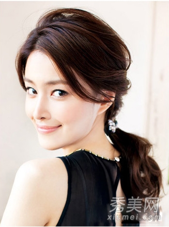 小编辑点评:低腰马尾优雅休闲,两边斜刘海勾勒出脸颊上华丽的线条,略显凌乱的卷发更显造型感。