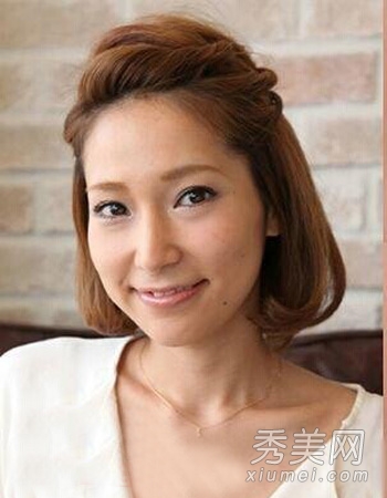 简单内扣的短发造型清新美丽。前额的刘海被卷起来,扎成一个小发髻,给人一种蓬松的感觉,既美化了脸型,又感觉清新。