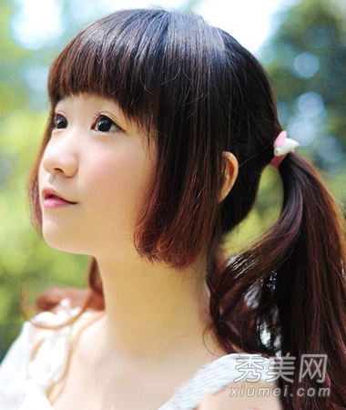 双马尾辫显示了女孩可爱的气质。烫发后的马尾辫发型更时尚、优雅。刘海整齐的发型设计衬托出女孩的大眼睛,非常漂亮迷人。